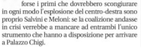 Ciò significa -mi chiederete- che Salvini non si sente inchiodato alla candidatura o comunque all’ambizione quirinalizia di Berlusconi e si riserva, una volta verificatane la impraticabilità in termini di voti parlamentari occorrenti all’elezione, di cercare altre soluzioni per concorrervi in modo decisivo? Sì, vi rispondo, Significa anche questo. Tanto è vero che sul già citato Giornale di famiglia di Berlusconi si levano quotidianamente, a più firme, moniti e preoccupazioni sulla tenuta degli alleati di centrodestra, dei quali non si gradiscono i “ma” che spesso accompagnano gli impegni o le promesse all’ex presidente del Consiglio. Eccovi la conclusione dell’editoriale odierno di Minzolini già citato per altri versi: “I primi che dovrebbero scongiurare in ogni modo l’esplosione del centro.destra sono proprio Salvini e Meloni: se la coalizione andasse in crisi verrebbe a mancare ad entrambi l’unico strumento che hanno a disposizione per arrivare a Palazzo Chigi”. Questo “strumento” è appunto l’alleanza con Berlusconi: rotta la quale nella corsa al Quirinale, si aprirebbero ben altri scenari politici ed elettorali per iniziativa o con la partecipazione dello stesso Berlusconi. A buon intenditore poche parole, come dice un vecchio proverbio.