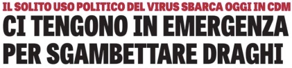 Sul quotidiano La Verità, in linea col nome stesso della testata, senza riferimenti polemici al vecchio giornale del partito comunista sovietico, che in russo si chiamava Pravda, si grida più esplicitamente che “ci tengono in emergenza per sgambettare Draghi”. E si lamenta “il solito uso politico del virus”, immedesimandosi forse negli umori e quant’altro di Salvini. Che ha appena aperto le sue consultazioni proprio sulla corsa al Quirinale come leader sia della Lega sia del centrodestra: ruolo o qualifica acquisita nel 2018 sorpassando Forza Italia nelle elezioni politiche.