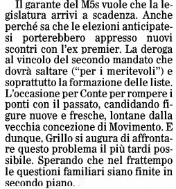 “Il garante del M5s -ha scritto o descritto Simone Canettieri sul Foglio non inventandosi nulla- vuole che la legislatura arrivi a scadenza, anche perché sa che le elezioni anticipate si porterebbero appresso nuovi scontri con l’’ex premier” Giuseppe Conte, messo forse imprudentemente a capo del movimento. “La deroga al vincolo del secondo mandato che dovrà saltare (“per i meritevoli”) e soprattutto la formazione delle liste” -ha spiegato Canettieri- potrebbero essere “l’occasione per Conte per rompere i ponti col passato, candidando figure nuove e fresche, lontane dalla vecchia concezione del Movimento. E dunque Grillo si augura di affrontare questo problema il più tardi possibile, sperando che nel frattempo le questioni familiari siano finite in secondo piano”. Già, perché il fondatore e tuttora garante del MoVimento ha anche problemi simili.