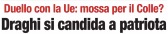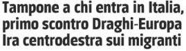 Neppure il Giornale della famiglia Berlusconi, anch’esso forse “con un occhio al Colle”, come dicono al Fatto Quotidiano, è arrivato a tanta comprensione e difesa del Draghi a sorpresa sovranista. Al quotidiano che fu di Indro Montanelli hanno preferito la versione dura del “tampone a chi entra in Italia” trasformatosi nel “primo scontro Draghi-Europa”, in coincidenza o in sintonia -come preferite- con “l’ira del centrodestra sui migranti”.