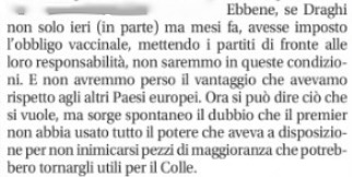 “Se Draghi -ha scritto nell’editoriale il direttore del Giornale berlusconiano Augusto Minzolini- non solo ieri (in parte) ma mesi fa avesse imposto l’obbligo vaccinale, mettendo i partiti di fronte alle loro responsabilità, non saremmo in queste condizioni. E non avremmo perso il vantaggio che avevamo rispetto agli altri Paesi europei. Ora si può dire ciò che si vuole, ma sorge spontaneo il dubbio che il premier non abbia usato tutto il potere che aveva a disposizione per non inimicarsi pezzi di maggioranza che potrebbero tornargli utili per il Colle”. L’allusione naturalmente è ai leghisti, formalmente impegnati come i fratelli politici di Giorgia Meloni a sostenere la candidatura al Quirinale di Silvio Berlusconi , ma sotto sotto tentati dall’aiutare Draghi a scalare il Quirinale.