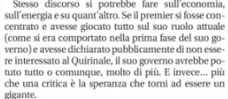 “Stesso discorso si potrebbe fare sull’economia, sull’energia e su quant’altro”, ha aggiunto con severità Minzolini spiegando: “Se il premier si fosse concentrato e avesse giocato tutto sul suo ruolo attuale (come si era comportato nella prima fase del suo governo) e avesse dichiarato pubblicamente di non essere interessato al Quirinale”, anzichè definirsi un nonno a disposizione delle istituzioni, “il suo governo avrebbe potuto tutto o comunque molto di più. E invece…”. “Più che una critica, è la speranza che torni ad essere un gigante”, ha concluso Minzolini risparmiandoci una spiegazione vera su quel “tutto” o “molto di più” che bisognava aspettarsi da Draghi su “economia, energia e quant’altro”. Lo farà evidentemente un’altra volta se il presidente del Consiglio, da qui al 24 gennaio, quando si comincerà a votare nell’aula di Montecitorio per la successione a Mattarella, non si sarà tirato fuori dalla corsa al Quirinale gridando la sua indisponibilità come il presidente uscente fa e fa dire dai suoi collaboratori a quanti insistono nel chiedergli un bis.
