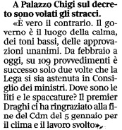 Evidentemente Giannini non condivide la rappresentazione dell’ultima riunione di governo fatta dal ministro forzista Renato Brunetta. Che al Corriere della Sera, pur raccontando del collega leghista Massimo Garavaglia arrivato ad avviarsi all’uscita per protesta contro ciò che stava per essere deciso, ha detto che “il governo è il luogo della calma, dei toni bassi, delle approvazioni unanimi. Da febbraio a oggi su 109 provvedimenti – ha spiegato- è successo solo due volte che la Lega si sia astenuta. Dove sono le liti e le spaccature?”.