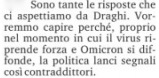A Mario Draghi, costretto dalle polemiche mediatiche e politiche a tenere domani una conferenza stampa sulla vaccinazione obbligatoria per gli ultracinquantenni e sulle altre misure adottate dal Consiglio dei Ministri, il direttore Massimo Giannini ha anticipato nell’editoriale di oggi della Stampa questa domanda: “Perché nel momento in cui il virus riprende forza e Omicron si diffonde la politica emana segnali così contraddittori?”.