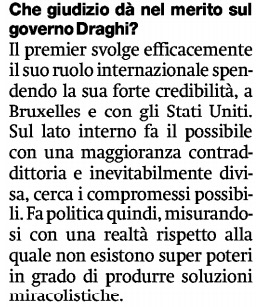 Come si concilino i due concetti è francamente difficile capire e tanto meno spiegare. Nè si può sospettare qualche forzatura del titolo riassuntivo di prima pagina perché il testo delle dichiarazioni di D’Alema è conforme. “Il premier -ha detto, in particolare, l’intervistato- svolge efficacemente il suo ruolo internazionale spendendo la sua forte credibilità, a Bruxelles e con gli Stati Uniti. Sul lato interno fa il possibile con una maggioranza contraddittoria e inevitabilmente divisa, cerca i compromessi possibili. Fa politica quindi misurandosi con una realtà rispetto alla quale non esistono superpoteri in grado di produrre soluzioni miracolistiche”. Meglio forse neppure Draghi avrebbe potuto e potrebbe dire di se stesso, dopo avere sottolineato nella sua ultima conferenza stampa una certa “voglia di lavorare insieme” che avrebbero ancora i partiti pur così diversi della sua maggioranza di emergenza o unità nazionale.