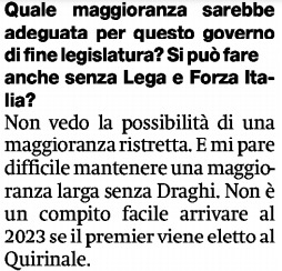 In quest’ultimo anche al manifesto D’Alema ha indicato, come da titolo nell’intera pagina interna che gli è stata dedicata, “un’esplosione di spirito antidemocratico”, sottolineato col colore rosso dal quotidiano ancora orgogliosamente comunista. Ma in rosso allarme, diciamo così, è anche la parte pur meno vistosa del titolo di prima pagina in cui si fa dire allo stesso D’Alema che “il lavoro di Draghi al governo non è finito”, né andrebbe interrotto.