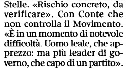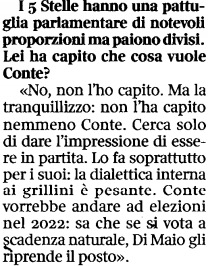 Quanto a Conte e alla sua capacità di incidere sulla partita, Renzi è stato tranciante. Interrogato retoricamente se ne avesse capito progetto e quant’altro, egli ha risposto: “No, non l’ho capito. Ma la tranquilizzo: non l’ha capito nemmeno Conte. Cerca solo di dare l’impressione di essere in partita. Lo fa soprattutto per i suoi: la dialettica interna ai grillini è pesante. Conte vorrebbe andare ad elezioni nel 2022: sa che se si vota a scadenza naturale, Di Maio gli riprende il posto”.