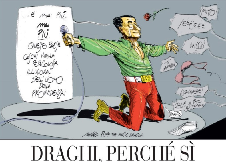Immaginazione per immaginazione, ne hanno avuta tantissima al Foglio dedicando a Draghi la vignetta-copertina del numero di lunedì per rilanciarne la candidatura boicottata da quello che pure era stato e per certi versi rimane ancora per Giuliano Ferrara e amici “l’amor nostro”. Che quel villano irredimibile di Marco Travaglio nella “cattiveria” quotidiana del suo giornale ha sospettato sia stato portato all’ospedale milanese San Raffaele, per i soliti ricoveri da controllo, facendogli credere di andare al Quirinale, nonostante la rinuncia.