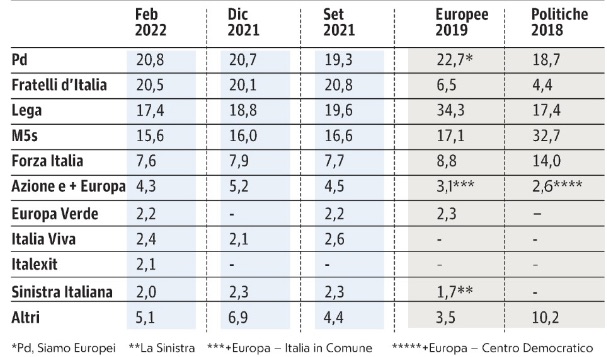 Oltre al partito di Berlusconi si è dimezzato dal 2018 quello delle 5 Stelle, sceso dal 32,7 dei tempi di Luigi Di Maio al 15,6 di questo febbraio di Giuseppe Conte. Al quale lo stesso Di Maio ha contestato pubblicamente la debacle quirinalizia della candidata Elisabetta Belloni, per quanto responsabile dei servizi segreti. Un Di Maio declassato dal solito Marco Travaglio a Di Mario, nel senso di adoratore politico del presidente del Consiglio Mario Draghi. “Guerre stellari” le ha chiamate lo stesso Fatto Quotidiano nel titolo di prima pagina di oggi.