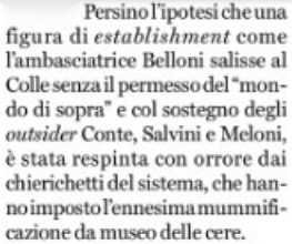 Il primo Conticidio risale a quella sera in cui Sergio Mattarella – spazientito al Quirinale dagli inutili tentativi dell’allora presidente del Consiglio prima di non dimettersi e poi di cercare una maggioranza non più condizionata dagli umori di Matteo Renzi ma neppure macchiata da Matteo Salvini o da Silvio Berlusconi, o da entrambi- sbottò chiamando al telefono Mario Draghi e spedendolo a Palazzo Chigi come un mezzo commissario. Che le Camere, spiazzate ma anche sollevate dallo scampato pericolo delle elezioni anticipate, promossero con una larga fiducia a commissario intero.