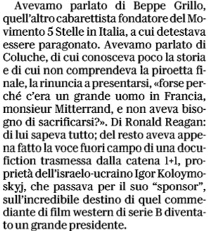 Ad un altro attore il buon Zelensky aveva invece accettato volentieri di essere paragonato, sapendo tutto di lui, non considerandolo affatto “quel commediante di film western di serie B” ritenuto invece dall’amico e avendolo persino imitato in teatro: l’americano Ronald Reagan, salito sino alla Casa Bianca.