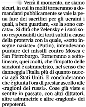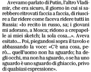 E Di Putin, “l’altro Vladimir” evocato con lui da BHL? Anche di quello Zelensky disse lì per lì di essere “sicuro che sarebbe riuscito a farlo ridere come tutti in Russia il giorno in cui si sarebbero trovati faccia a faccia”. Eppure dopo tanta spavalda sicurezza di attore, comico e ormai anche politico Zelensky “piegandosi sopra il tavolo e abbassando la voce” nel ristorante dove qualcuno avrebbe potuto sentirlo minacciandone già allora la vita, aggiunse: “C’è una cosa però: quell’uomo non ha sguardo. Ha degli occhi, ma non ha sguardo. O se ha uno sguardo è di ghiaccio, privo di qualsiasi espressione”.