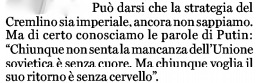 Da ostinato ottimista come ho imparato a conoscerlo a suo tempo, pur tra insofferenze e sfoghi cui si abbandonava quando si sentiva deluso o, peggio, tradito da qualcuno sulla strada dei suoi progetti sempre ambiziosi, spesso vissuti col cardiopalma anche dai più stretti collaboratori e familiari, temo che Berlusconi ancora condivida paradossalmente di Putin, insieme con l’insospettabile Barbara Spinelli che ne ha appena scritto sul Fatto Quotidiano, la frase che ne fece a suo tempo un mezzo campione di affidabilità, a metà strada fra il romanticismo e il realismo: “Chiunque non senta la mancanza dell’Unione Sovietica è senza cuore, ma chiunque voglia il suo ritorno è senza cervello”. Che è esattamente quello che l’amico di Berlusconi sta rischiando di perdere, se non l’ha già perso, gestendo come ha fatto sinora il problema dei rapporti con l’Ucraina e, di riflesso, col resto del mondo, compresa la confinante e diffidentissima Cina: un enigma forse ancora maggiore di quello che l’Urss era apparsa a Winston Churchill, per avendovi appena collaborato nella guerra contro Hitler, cominciata peraltro -e non a caso- con un patto fra lo stesso Hitler e Stalin per spartirsi la Polonia.