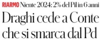 Per una volta va riconosciuto a Marco Travaglio, dichiaratamente nostalgico di Conte a Palazzo Chigi, che non ha esagerato rappresentando la situazione politica con questo titolo sul Fatto Quotidiano: “Draghi cede a Conte che si smarca dal Pd”. E spiegando nel cosiddetto occhiello sul riarmo scritto in rosso: “Niente 2024: 2% del Pil in 6 anni” per rispettare l’impegno assunto anche dall’Italia nell’Alleanza Atlantica di portare appunto a quel livello le spese militari in ciascuno dei paesi associati.