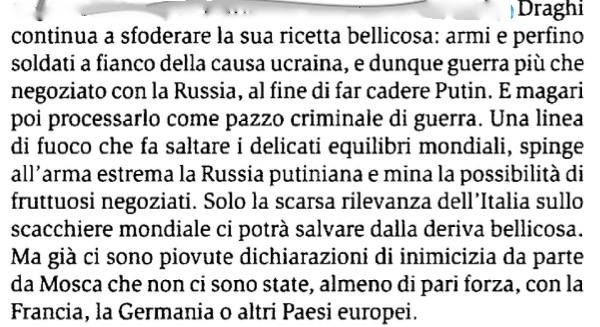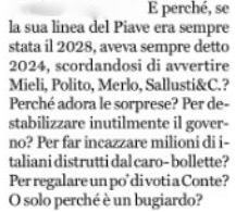 Sempre per una volta, il nostalgico di Conte è stato villano ma non arbitrario nel dare del “bugiardo” all’odiato Mario Draghi rinfacciandogli così nel suo editoriale trionfalistico di giornata la conversione alla scadenza del 2028 indicata dal ministro del Pd alla Difesa Lorenzo Guerini , nonostante il 2024 dell’intesa a suo tempo sottoscritta: “Perché, se la sua linea del Piave era sempre stata il 2028, aveva sempre detto 2024, scordandosi di avvertire Mieli, Polito, Merlo, Sallusti&C? Perché allora le sorprese? Per destabilizzare inutilmente il governo? Per far incazzare milioni di italiani distrutti dal caro-bollette? Per regalare un pò di voti a Conte? O solo perché è un bugiardo?”, appunto.