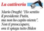 Sentite “la cattiveria” di giornata del Fatto Quotidiano, naturalmente, diretta e senza intermediari per una lettura appropriata anche degli sviluppi della situazione politica in Italia, e più in particolare dei rapporti fra il Conte contrario all’aumento delle spese militari e i suoi alleati di governo: “Mario Draghi: “Ho sento il presidente Putin, ma non ho capito niente”. Non ti preoccupare, ora ti spiega tutto Biden”. Invece Draghi dovrebbe farselo spiegare -par di capire- da Papa Francesco. Di cui il presidente del Consiglio- cattiveria per cattiveria- è in qualche modo collaboratore, oltre che amico e devoto, come membro della Pontificia Accademia delle Scienze Sociali.