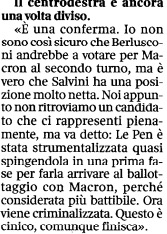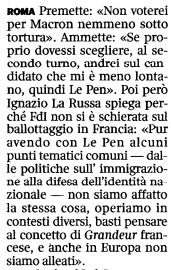 Come conservatrice Giorgia Meloni ha preso le distanze nette dalle figure internazionali care ancora a Salvini come Putin e la candidata all’Eliseo Marine Le Pen, arrivata al ballottaggio del 24 aprile col presidente uscente della Repubblica francese Emmanuel Macron. Ma il maggiore forse fra i “fratelli d’Italia”, Ignazio La Russa, l’ha appena smentita sul Corriere della Sera dicendo che lui voterebbe Le Pen senza alcuna esitazione, pur non condividendone al cento per cento la linea. Addirittura, da amico personale che si vanta di essere di Berlusconi, di cui è stato peraltro ministro della Difesa, La Russa si è avventurato ad esprimere dubbi sulle simpatie attribuite allo stesso ex presidente del Consiglio per Macron. “Io non sono così sicuro -ha detto- che Berlusconi andrebbe a votare per Macron al secondo turno”.
