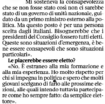 Una cosa comunque è stata esclusa da Draghi per il suo futuro: quella implicita di mettere su un partito e quella esplicita di candidarsi alle elezioni. E’ bene -ha riconosciuto- che il presidente del Consiglio venga “eletto”, ma il suo passaggio a Palazzo Chigi è e resterà un evento eccezionale.