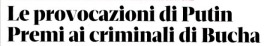 Così il capo del Cremlino ha voluto essere coerente a modo suo, cioè per niente, con l’impegno preso qualche giorno fa di partecipare all’accertamento delle responsabilità dei “crimini di guerra” compiuti in quella terra da “denazificare”, secondo lui. L’uomo è semplicemente un provocatore, come lo ha liquidato il quotidiano Domani nel titolo di prima pagina proprio a proposito della premiazione della brigata di Bucha, con’è ormai destinata a passare nella storia.