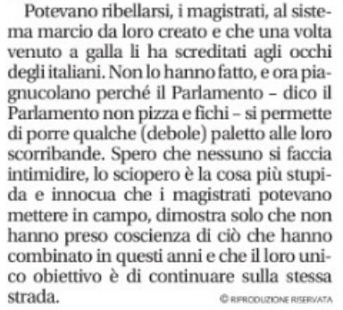 I magistrati si sono messi sulla strada dello sciopero -peraltro deliberandolo nella loro assemblea generale con una maggioranza di 1081 voti contro 169 e tredici astensioni- per essere “ascoltati”, come dicono i loro sindacalisti: in realtà, essendo stati ben consultati, e quindi ascoltati, sia dal governo sia dalla Camera, per cercare ancora di imporre i loro ormai abituali veti, in difesa di certe prerogative e abitudini. Di cui alcuni dei loro più qualificati colleghi, come Nino Di Matteo, consigliere superiore della Magistratura, hanno avvertito il pericolo che possano essere scambiati per privilegi castali proprio per il modo col quale vengono difesi. Lor signori, li chiamerebbe la buonanima di Fortebraccio sulla buonanima dell’Unità, vogliono giudicare ma non essere giudicati, neppure fra di loro, soprattutto col metodo che chiamano spregiativamente “meritocratico”.