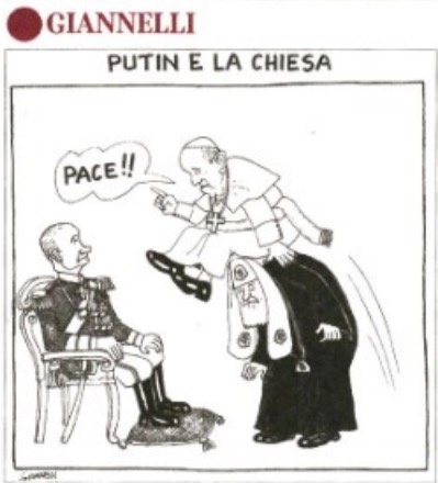 Sui rapporti fra Putin e il Papa, o viceversa, è divertente la vignetta di prima pagina del Corriere della Sera, in cui Emilio Giannelli strappa Francesco dalla sedia a rotelle sulla quale è costretto in questi giorni per il suo ginocchio e lo fa saltare sulla schiena di un curvo Patriarca di Mosca per gridare “pace” in faccia a un Putin quasi napoleonico. L’unico errore che si può contestare a Giannelli è il titolo al singolare che ha voluto usare, o forse hanno usato quelli della redazione del giornale: “Putin e la Chiesa”. Nel nostro caso sono due le Chiese: quella ortodossa di Kirill, supina al Cremlino o addirittura istigatrice, e quella cattolica romana e universale di Francesco.