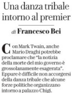 Due titoli giornalistici danno bene l’idea della situazione. Uno è quello di Repubblica su un commento di Francesco Bei: “Una danza tribale intorno al premier”. L’altro è quello della Stampa su un commento dell’ex direttore Marcello Sorgi: “Ma adesso Conte non tiri la corda”. Che potrebbe spezzarsi più rovinosamente per lui che per Draghi, col quale è perfettamente allineato il ministro grillino degli Esteri Luigi Di Maio.