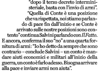 Sarà stato per una simpatia da omonimia -parlando con il Giacomo del Fatto Quotidiano- o per calcolo perfido, volendo creare problemi proprio al suo interlocutore, Matteo Salvini ha voluto riservare al giornale di Marco Travaglio uno scoop. Egli ha detto di avere posto nella maggioranza di govermo ben prima di Giuseppe Conte, che se ne è poi vantato nella “piazza pulita” di Corrado Formigli, il problema della fine degli aiuti militari italiani all’Ucraina. Bastano quelli già accordati. Non si deve andare oltre il terzo decreto interministeriale col quale sono state praticamente imballate le ultime forniture d’armi a Kiev, o dov’altro arrivano quelle occidentali a Zelensly cercando di metterle al riparo dai bombardamenti russi.
