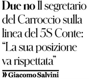 Le parole sono state rispettate nel testo pubblicato, un pò distorte però nel titolo per amore, rispetto e quant’altro dell’ex presidente del Consiglio da parte del giornale di Travaglio. Che ne denunciò “l’omicidio” più di un anno fa, quando a Palazzo Chigi gli subentrò Mario Draghi per volere del capo dello Stato. Nel titolo deciso nella redazione del Fatto Quotidiano si legge solo che la posizione di Conte “va rispettata”. Che sia sopraggiunta a quella di Salvini è bene che si sappia e si veda di meno. L’amicizia è amicizia, perdio. Chissà se Berlusconi ha qualcosa da dire o ridire sulla sua amicizia privilegiata con Salvini nel centrodestra.