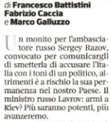 Che l’aria sia ormai questa, tra Farnesina e Palazzo Chigi, lo si capisce dalla succinta cronaca in prima pagina sul Corriere della Sera a firma di Francesco Battistini, Fabrizio Caccia e Marco Galluzzo. Secondo i quali Razov, per quanto ancora combattivo, polemico e quant’altro, è stato invitato bruscamente a “smettere di accusare l’Italia con i toni di un politico, altrimenti è a rischio la sua permanenza nel nostro Paese”.