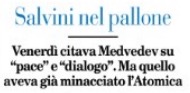 E pensare che 21 anni fa, appunto, proprio vedendo in televisione quelle due torri di New York che bruciavano come fiammiferi nella famosa rappresentazione scritta all’istante da una testimone eccezionale come Oriana Fallaci, avevo quasi rimpianto la Mosca sovietica. Dove- pensai- nessuno avrebbe mai permesso che dal Medio Oriente e dintorni potesse partire un ordine bestiale come fu quello di Osama Bin Laden. Non ci crederete, ma lo stesso pensiero mi è venuto leggendo l’esplosione d’odio, o d’ambizione a succedere a Putin, di quel Mevdev scambiato non più tardi di venerdì scorso in Italia per “un uomo di pace” da Matteo Salvini, come gli ha rinfacciato oggi Il Foglio in prima pagina.