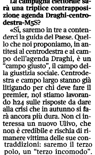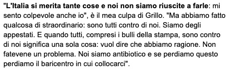 Invece Grillo -diavolo di un comico- ha deciso di uscire da questa legislatura sul suo blog come da un lager nazista, mescolandosi con i sopravvissuti. E dopo avere imposto a Conte -liberatoriamente definito “stronzo” sul Fatto Quotidiano da Marco Travaglio in persona, dopo tante lacrime per la estromissione omicida da Palazzo Chigi- il divieto di deroga al limite del doppio mandato. Con ciò egli ha ripreso di fatto la guida di ciò che resta del movimento ridotto ormai ad una scissione continua. Ed ha scopiazzato Benito Mussolini ed Enrico Berlinguer, che così diversi fra loro solo lui poteva mettere in qualche modo insieme.