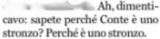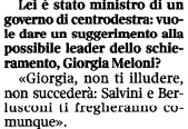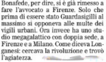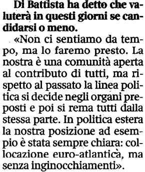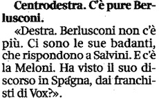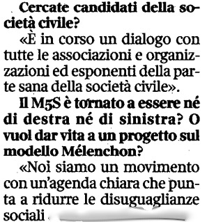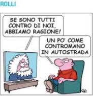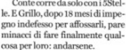 Di Mussolini, già imitato qualche giorno fa per il motto di “molti nemici molto onore”, Grillo ha riproposto anche quel “Vincere” che da bambino, a guerra già finita e perduta, vedevo ancora scritto in nero a caratteri di scatola sulle case cantoniere ed altri edifici. Anche il MoVimento 5 Stelle può, deve ancora vincere la sua guerra, con Grillo sempre alla testa, garantito solo dalla capacità già dimostrata una volta al volante di un’auto di buttarsi fuori in tempo per salvarsi, lasciando morire nel precipizio gli ospiti.