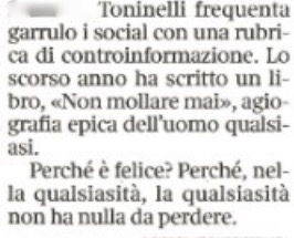 A Grillo che vanta la diversità sua e del suo popolo, chiamiamolo così, ha in un verto senso risposto oggi Aldo Grasso sul Corriere della Sera occupandosi dell’ex ministro pentastellato e riccioluto Danilo Toninelli, orgoglioso di provare il divieto del terzo mandato e autore, l’anno scorso, di un libro agiografico dell’uomo qualsiasi, o qualunque, come si dichiarava la buonanima di Guglielmo Giannini. “La qualsiasità non ha nulla da perdere”, ha osservato Grasso spiegando la felicità di Toninelli.