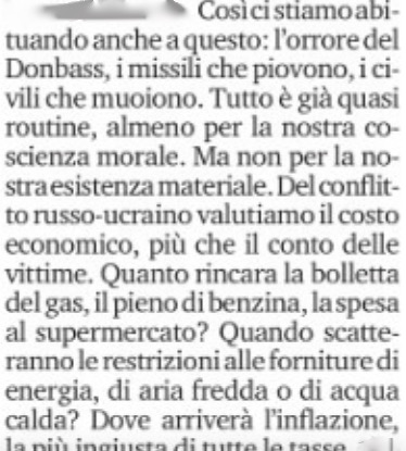 Scrive oggi giustamente il direttore Massimo Giannini sulla Stampa contro l’assuefazione “anche a questo: l’orrore del Donbass, i missili che piovono, i civili che muoiono. Tutto è già quasi routine, almeno per la nostra esistenza materiale. Del conflitto russo-ucraino valutiamo -ha scritto ancora Giannini- il costo economico più che il conto delle vittime”, per cui ci chiediamo “quanto rincara la bolletta del gas, il pieno di benzina, la spesa al supermercato, quando scatteranno le restrizioni alle forniture di energia, di aria fredda o di acqua calda, dove arriverà l’inflazione, la più iniqua di tutte le tasse”. E magari qualcuno -mi permetto di aggiungere- si chiederà, accodandosi ai putiniani d’Italia, se davvero ci conviene allungare questa guerra aiutando la resistenza degli ucraini, anziché convincerli con le buone alla resa, in concorrenza con le cattive del Cremlino.
