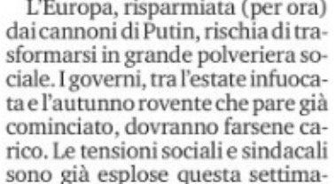 Eppure lo stesso Giannini, pur dirigendo un giornale preso di mira dall’’ambasciatore russo in Italia che lo denunciò alla Procura di Roma all’’inizio del conflitto per falso e contorni, si è lasciato scappare una “Europa risparmiata (per ora) dai cannoni di Putin”, ma che “rischia di trasformarsi in grande polveriera sociale”, per cui “i governi dovranno farsene carico”: compreso quello italiano di Mario Draghi, dal quale non a caso i grillini vorrebbero uscire per non perdere anche quei pochi voti che sono rimasti al loro movimento.