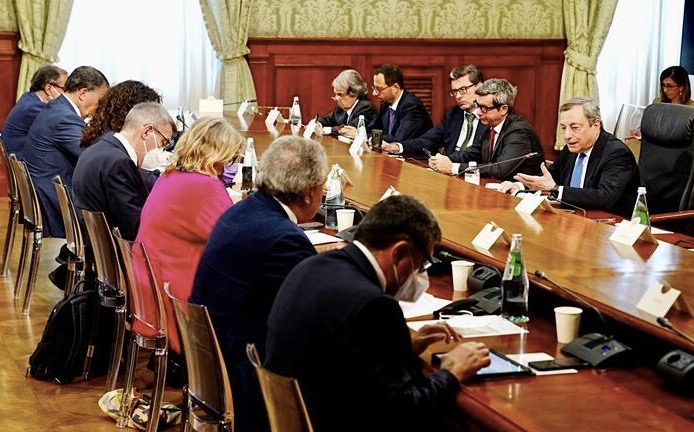 Anche l’incontro di Mario Draghi e dei suoi ministri con i sindacati per “il cantiere” del salario minimo e del taglio al cuneo fiscale, come lo ha chiamato il giornale della Confindustria 24 Ore, o il “patto anticrisi”, secondo Avvenire, il quotidiano dei vescovi italiani, ha risentito del clima politico di provvisorietà, instabilità e quant’altro creato dalle condizioni della maggioranza. Dove Giuseppe Conte e Matteo Salvini si inseguono nelle minacce e negli “ultimatum” lamentati dal presidente del Consiglio. Ma Conte primeggia per il caos del MoVimento 5 Stelle aggravatosi con la scissione, peraltro non ancora completa, di Luigi Di Maio.