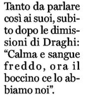 L’onnipotenza attribuitasi da Conte fa diventare paradossalmente posticcia persino l’eco internazionale delle dimissioni di Draghi, nel bel mezzo della guerra in Ucraina e dei suoi riflessi geopolitici, economici e sociali. Draghi, secondo la solitamente felice rappresentazione giornalistica che il manifesto sa fare delle situazioni complicate, è tra “le stelle e le strisce”: le stelle cadenti di Conte e le strisce americane di Biden, che fa il tifo per lui in buona compagnia europea.