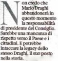 Una conferma, anzi una reiterazione delle dimissioni da presidente del Consiglio -respintegli la settimana scorsa dal capo dello Stato, che lo ha rinviato alle Camere per una verifica politica, alla luce del sole, dopo lo sbilenco rifiuto della fiducia dei grillini al Senato sul decreto degli aiuti a famiglie e imprese- “sarebbe una mancanza di rispetto verso il Paese e i cittadini”, ha scritto Monte. “E potrebbe intaccare -ha aggiunto mirando ancora più in alto- la legacy dello stesso Draghi, il suo posto nella storia”.