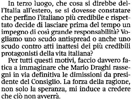 “Per tutti questi motivi -ha concluso l’ex presidente del Consiglio- faccio davvero fatica a immaginare che Mario Draghi rassegni in via definitiva le dimissioni da presidente del Consiglio. La forza della ragione, non solo la speranza, mi induce a credere che ciò non avverrà”.