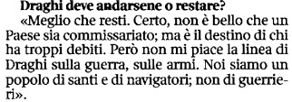 Draghi se ne sta sulle sue, magari ad ammirare l’Altan di Repubblica che partecipa a suo modo agli appelli a restare, godendosi i guai in cui è incorso non lui ma Conte. Che con la sua sostanziale offensiva ha aggravato confusione e crisi in quel che resta del MoVimento 5 Stelle, prossimo ad altri abbandoni, dopo quelli già sostanziosi di Luigi Di Maio e amici.