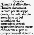 Eppure c’è qualcosa delle figurine di Grillo, dopo le sue figuracce, che non consente di liquidarle come estemporanee. E’ qualcosa fatto osservare dallo stesso titolo del Corriere nella parte in cui rileva una violazione dello statuto del MoVimento di cui Grillo è disinvoltamente garante, al suo solito. “Quando l’identità si affievolisce, l’insulto ricompatta. Peccato per Giuseppe Conte, che nello statuto -ha ricordato Alessandro Trocino- aveva fatto un bel compitino”. Che suona così nel testo voluto dall’ex presidente del Consiglio e accettato a parole da Grillo: “Le espressioni verbali aggressive devono essere considerate al pari di comportamenti violenti”.