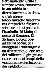 Tutti subito a pensare alla solita “rabbia trasformata in divertissement” dal comico Beppe Grillo- come ha scritto Alessandro Trocino sul Corriere della Sera- quando il garante e quant’altro del Momento 5 Stelle ha annunciato il suo album delle figurine per mettere alla gogna i traditori, transfughi, zombie, contagiati dal “morbo dei partiti” e via continuando in un “linciaggio digitale”, sempre secondo il Corriere della Sera.