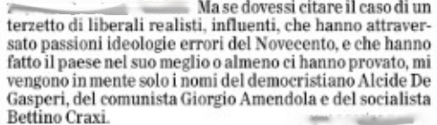 Giuliano Ferrara sul Foglio, per esempio, come in una vista al cimitero anziché ai giardinetti, già deluso, preoccupato e quant’altro perché l’adesso preferito Pd di Enrico Letta non avesse compreso l’utilità di un’alleanza anche con i “grillozzi”, come li chiama lui affettuosamente, si è messo a rimpiangere quei “tre liberali realisti, influenti” rispondenti ai nomi “del democristiano Alcide De Gasperi, del comunista Giorgio Amendola e del socialista Bettino Craxi”. Sembrava di leggere il più divino Dante in quel sonetto famosissimo che dice: “Guido, i’ vorrei che tu e Lapo ed io fossimo presi per incantamento e messi in un vasel, ch’ad ogni vento per mare andasse al voler nostro e mio”.