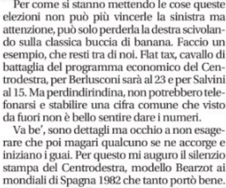 Alessandro Sallusti su Libero ha sognato il suo centrodestra in “silenzio stampa, modello Bearzot ai mondiali di Spagna 1982, che tanto portò bene”. Egli teme che a furia di sparare numeri come stanno facendo Silvio Berlusconi e Matteo Salvini con la flat tax al 23 o al 15 per cento, da venditori di pentole al mercato, sfuggirà alla sua parte politica il successo dato per scontato persino dagli avversari. “Ma perdindina -ha scritto il direttore di Libero, sempre a proposito di Berlusconi e Salvini- non potrebbero telefonarsi e stabilire una cifra comune, visto che da fuori non è bello sentire dare i numeri?”. “Va bè, sono dettagli ma occhio a non esagerare ché poi magari qualcuno se ne accorge e iniziano i guai”, ha ammonito l’amico, estimatore e quant’altro del Cavaliere e del Capitano.