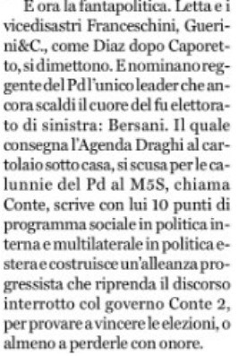 In una conclusione dichiaratamente “fantapolitica” del suo solito, abbondante editoriale di giornata Marco Travaglio ha immaginato dimissionari, “come Diaz dopo Caporetto”, il segretario del Pd Enrico Letta e “i vicedisastri Franceschini, Guerini&C”, sostituiti come “reggente” da Pier Luigi Bersani, “l’unico leader che ancora scaldi il cuore del fu elettorato di sinistra”.