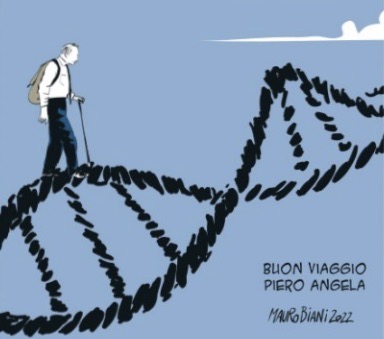C’è proprio tutto, anche contro la scomposta campagna elettorale avvertita negli ultimi giorni della sua lunghissima vita, in quella definizione dell’Italia “difficile Paese” nel messaggio di commiato tanto orgoglioso quanto toccante lasciato da Piero Angela prima del “buon viaggio” auguratogli con le lacrime negli occhi dal figlio Alberto. Un viaggio che meglio non poteva essere rappresentato nella vignetta di Mauro Biani su Repubblica, in cui Piero con lo zaino sulle spalle percorre il ponte dell’infinito.
