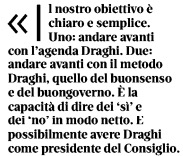 Contemporaneamente, tuttavia, il leader del terzo polo Calenda, affiancato dalle ministre ex forziste Mariastella Gelmini e Mara Carfagna, dichiarava in una conferenza stampa: “Il nostro obiettivo è chiaro e semplice: Uno. andare avanti con l’agenda Draghi. Due: andare avanti con il metodo Draghi: quello del buon senso e del buon governo. E la capacità di dire dei sì e dei no in modo netto. E possibilmente avere Draghi come presidente del Consiglio” anche nella nuova legislatura, per quanto scontata appaia al centrodestra la propria vittoria elettorale e il conseguente approdo di Giorgia Meloni a Palazzo Chigi come prima donna nella storia d’Italia. O per quanti sforzi faccia il segretario del Pd Enrico Letta di immaginarsi di nuovo presidente del Consiglio, con l’aiutino magari dello stesso Draghi, dopo la brutta esperienza del 2014, quando l’appena eletto segretario del suo partito Matteo Renzi gli disse di “stare sereno” mentre si preparava a scalzarlo alla guida del governo.