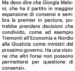 Io- ripeto- non voto la Meloni, per quanto l’amico ma neppure lui votante Gabriele Albertini abbia appena detto di aspettarsi da lei la nomina dell’eccellente Carlo Nordio a Guardasigilli, ma trovo francamente inaccettabile il ruolo di strega politica che, volente o nolente, le affibbia con tanto spreco di firme e di carta un giornale che, come Giuseppe Conte agli occhi di Goffredo Bettini sino a qualche mese fa, o tuttora, si ritiene il punto di riferimento più alto dei progressisti, intesi stavolta come lettori e non elettori.