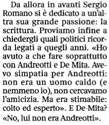 Sentite con quanta discrezione ed efficacia lo stesso Romano ha appena descritto quella esperienza, intervistato dal Corriere della Sera e parlando dei politici con i quali aveva avuto rapporti in quegli anni: “Ho avuto a che fare soprattutto con Andreotti e De Mita. Avevo simpatia per Andreotti: non era un uomo caldo (e nemmeno io), non cercavamo l’amicizia. Ma era stimabile: colto ed esperto”. E De Mita? ha insistito l’intervistatore? “No, lui non era Andreotti”. Grande ambasciatore, e ancor più grande il suo ex e ormai compianto ministro degli Esteri. Che amava tanto la Germania, come disse una volta parlando a Pisa, da preferirne due anche quando cominciò a prospettarsi l’unificazione,ma senza per questo mettersi a lavorare contro.