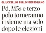 “Pd, M5S e terzo polo torneranno insieme ma solo dopo le elezioni”, si leggeva nel titolo dell’editoriale di Domani dando a costoro degli “uccellini sullo stesso ramo”. E risparmiando il meno poetico ma forse più pertinente paragone -dal punto di vista di De Benedetti, Ferrara e Maltese- con i famosi polli che nei Promessi Sposi di Alessandro Manzoni si beccavamo mentre Renzo li portava alla mensa dell’avvocato Azzeccacarbugli.